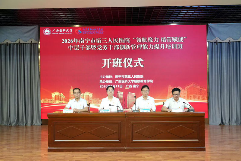 4月11日,继续教育学院顺利举办2026年南宁市第三人民医院“领航聚力 精管赋能”中层干部暨党务干部创新管理能力提升培训班。南宁市第三人民医院党委书记倪钰荣、党委副书记、院长谢丽圣,继续教育学院院长周波、副院长韦先良等出席开班仪式,医院领导班子、中层干部、党务干部及重点职能科室干事共150余人参加培训。